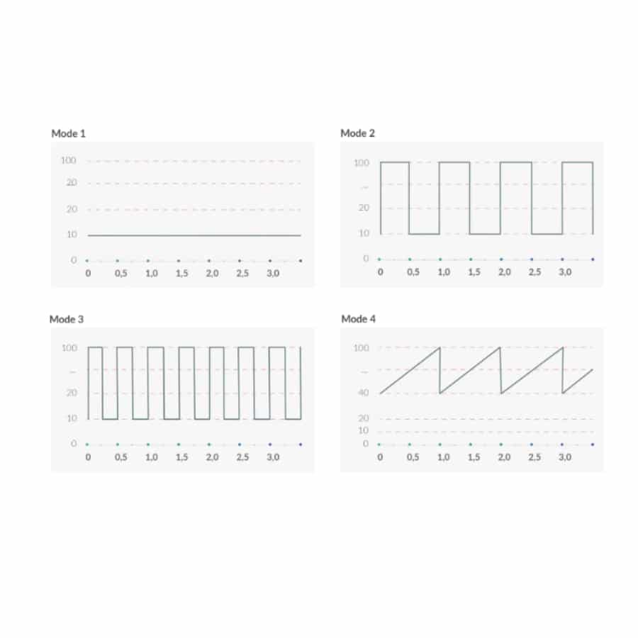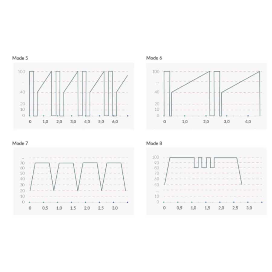 Each of the five electrostimulation programs your E-Stim Vibe offers is intended to give you a new and thrilling sensory experience. Each press on the e-stim button switches forward to the next program. To avoid making the wrong setting, please wait a moment before increasing the intensity when you have switched program, as the wave-pattern programs (2 and 4) only reach their highest level of stimulation after around 3 seconds.