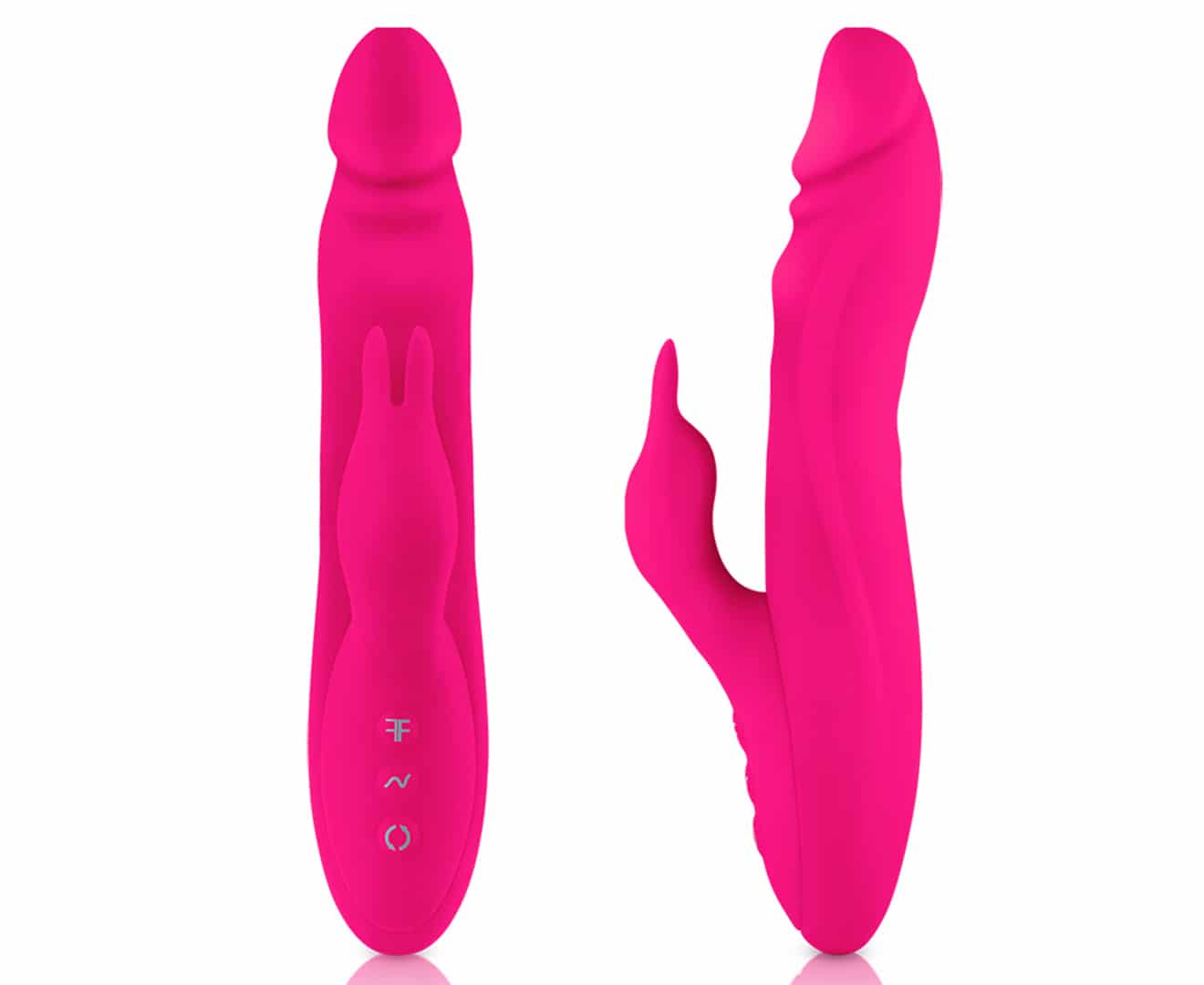 The clit stimulator (rabbit) vibrates while the G-spot stimulator rotates, creating a unique, new pleasure.