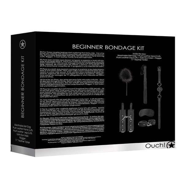 Ouch! Beginners Bondage Kit For those couples looking start exploring their kinky side, this is the kit for you. Comes with all the essesntials you need to heat up your sex life. Kit contains Breathable ball gag, bonded leather hand and leg cuffs, flogger, 11 inch feather tickler, and satin eye mask.