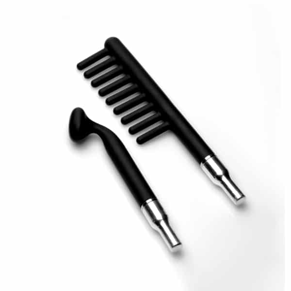 Sizzle the senses with electrosex! This Violet Wand set provides unique and intense sensations with silicone attachments that will not shatter like delicate glass. The mushroom-shaped accessory is ideal for sending pinpoint zaps of electricity into your slave or subs supple flesh. The comb features 9 teeth to transmit the current along a long strip of skin. Finally, the flogger will send a shock into them with every sensual stroke or swinging slap! The actual wand allows you to play with a wide range of power, from tingles to jolts. It features a silicone handle that enables a sturdy grip and a long cord that allows you to move freely around your playspace. Compatible with most violet wand attachments.