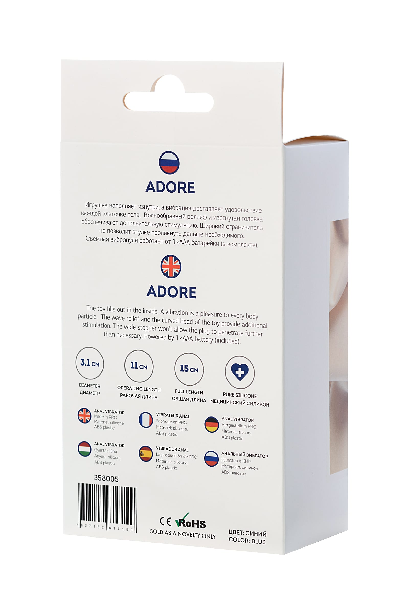 ADORE anal vibrator COLOUR: blue. SIZE: 15 cm. DIAMETER: 3.1. MATERIAL: Silicone ABS-plastic . BATTERY: 1xAAA. FUNCTIONS: vibro bullet