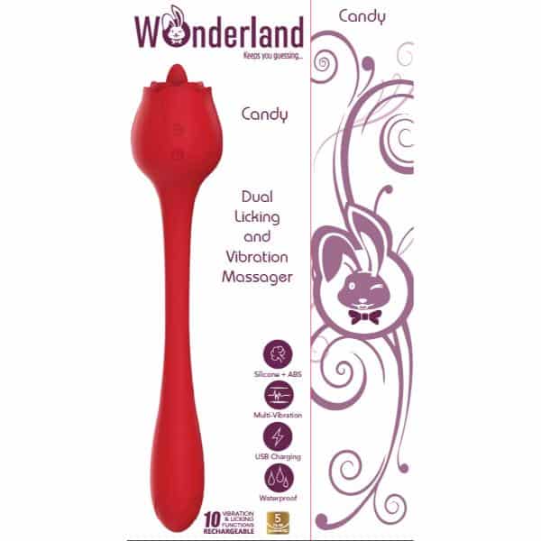 DUAL LICKING AND VIBRATION MASSAGER Meet Wonderland’s Candy, a seductive dual licking and vibration massager, crafted from silky-smooth silicone. With two whisper-soft independent motors for discreet indulgence, it promises double the pleasure and double the fun. In passionate red, this gorgeous super toy, with its rose-shaped clitoral licking vibrator and bendable shaft, is ready to bloom in your garden of pleasure. Experience dizzying heights of ecstasy with the Candy Dual Licking and Vibration Massager. Designed for both vaginal and clitoral stimulation, Candy takes your ‘me time’ to a whole new level. Surrender to the sheer sensual pleasure as anticipation and desire intertwine, transforming each orgasm into an electrifying experience. Explore all 10 incredible vibration functions with this hot red toy, customisable to your desires, for an orgasmic journey like no other. Indulge in the tantalising fusion of sensation and pleasure as multiple licks caress your clitoris, the tongue-like licking enveloping all your senses, sending shivers of bliss down your spine. Next, let the flexible shaft and rounded head tease you internally, satisfying your deepest desires. Crafted from luxurious and high-quality silicone and ABS, the waterproof design of the Candy Dual Licking and Vibration Massager invites indulgent solo play in the bath or shower, or intimate moments with a partner. Satisfy your deepest desires and erotic fantasies with the Candy Dual Licking and Vibration Massager. With USB charging for uninterrupted pleasure, this seductive companion is always ready to fulfill your every craving.