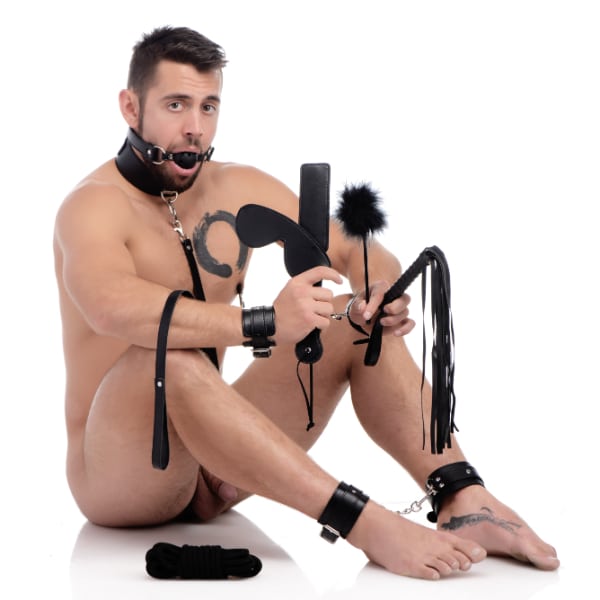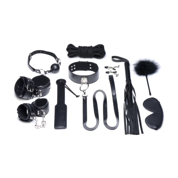 Bondage Kit 10 Bondage Essentials for anyone wanting to explore the dark side of their bedroom! Everything you need to tie up, gag, and punish your partner is included in this Deluxe 10 Piece Bondage Set: a thick blindfold, breathable ball gag, wide strap collar with leash, a set of wrist and ankle cuffs, a pair of nipple clamps, a versatile bundle of rope, a handy little paddle, a tempting tickler, and a satisfying flogger.